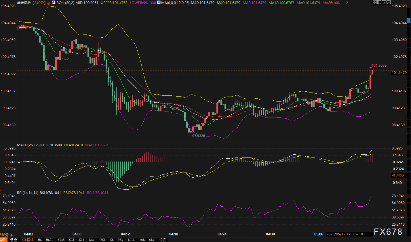 嘉盛——周一(5月12日),受中美贸易会谈联合声明推动,美元指数在亚洲时段迅速拉升,日内涨幅达1.20,报价攀升至101.6251,创下近三个月新高。这一突破性行情不仅反映市场对贸易摩擦缓和的积极定价,更揭示了技术面与基本面的共振效应。以下从多周期视角解析当前市场动能及未来潜在路径。