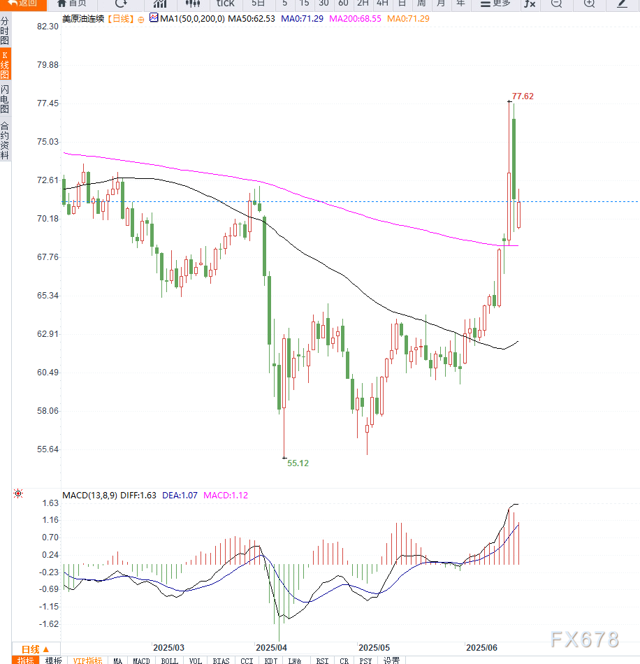 潜在供应中断成为价格上涨的核心风险点   作为石油输出国组织成员国中第三大产油国,伊朗的石油供应具有重要市场份量。一旦冲突造成出口停滞或港口关闭,将对全球市场造成冲击。   “伊朗的石油出口每减少100万桶/日,油价就有可能上涨4美元,”市场风险顾问机构Energy Aspects表示。   美国总统特朗普呼吁“所有人员撤离德黑兰”,并称伊朗本应在以色列空袭前签署核协议。他还表示相信该国目前更愿意达成协议。该言论表明虽然局势紧张,但仍存在通过外交缓解的可能性。   不过,如果外交谈判成功并促成制裁解除,该国石油出口可能增加,从而对冲部分价格上涨。   据市场调查显示,有分析指出:“任何关于恢复出口的协议都可能使原油供应增加,成为未来价格压制因素。”   与此同时,OPEC与包括俄罗斯在内的OPEC+联合体周一表示,预计全球经济在2025年下半年仍具韧性,并下调了对2026年非成员国石油供应增速的预期。   “OPEC+维持对需求面的温和乐观,同时预判非OPEC+供应将在后期减缓,这可能为原油市场提供支撑。”——国际能源经济研究中心首席分析员   从日线图形来看,美国WTI原油价格突破自5月中旬以来的震荡整理区间,目前稳步站上20日与50日均线,显示多头情绪回暖。   技术指标方面,RSI指标回升至60上方,MACD指标呈现金叉态势,预示动能增强。若后续能稳固在72.50美元上方,下一压力位将指向75.80美元区域;   下方支撑位关注70.00美元与68.90美元一线。整体图形结构显示短线偏多趋势,但需警惕地缘消息带来的高波动回调风险。